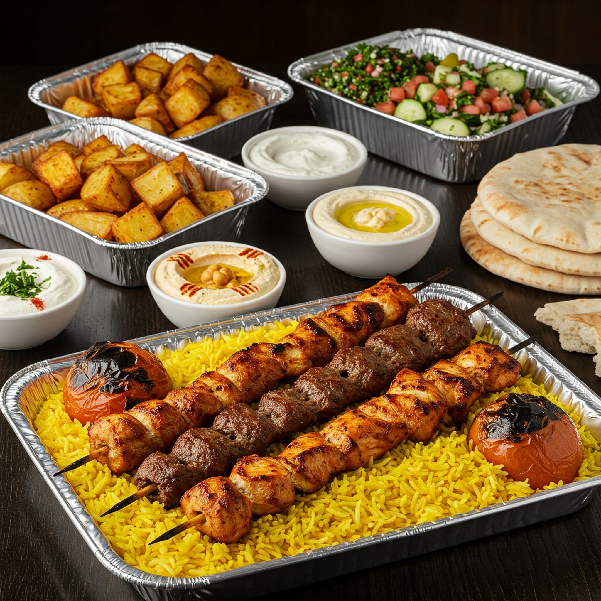 Enjoy a delicious Kebab & Kefta BBQ party! We offer a variety of grilled skewers: beef, lamb, shish tawouk, beef...